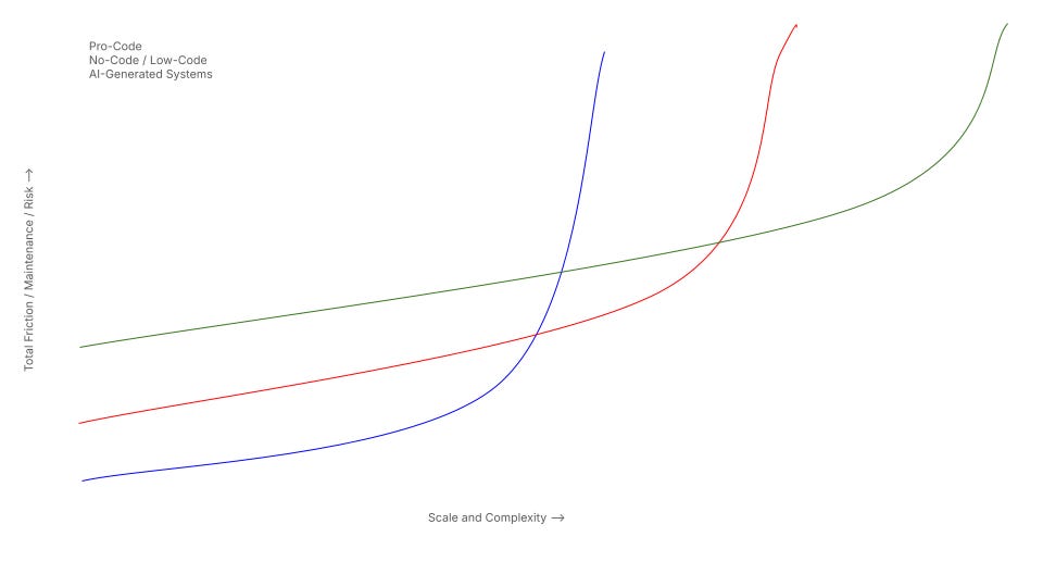 AI-generated systems start with the lowest entry cost. Minimal skill barrier. Absurdly fast for simple artifacts - websites, forms, automations. Things like Lovable or prompting your way with Claude Code without ever actually opening an IDE falls into this category. But the logic is opaque. And the exponential failure point appears early. Add scale, add interdependencies, and watch it buckle.